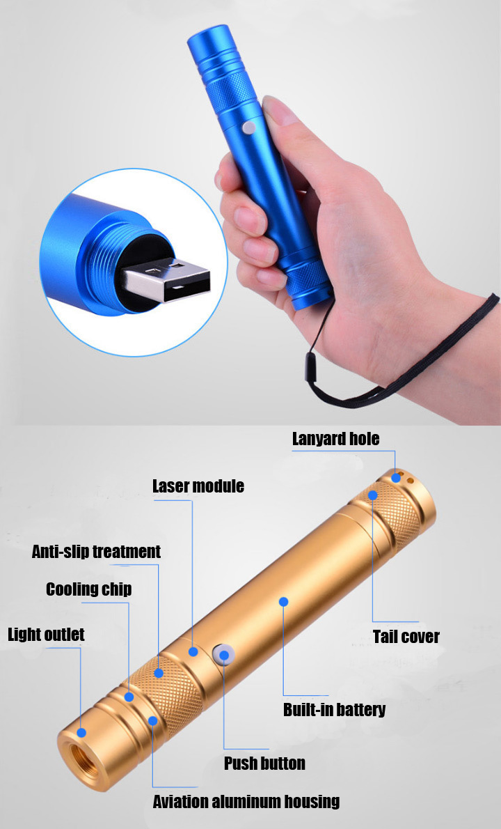 Deze violette laserpen is anders dan de oude versie, wat praktischer en duurzamer is. Het wordt geleverd met de USB-interface en ingebouwde batterij, gemakkelijk te gebruiken en veilig. Dit model kan direct worden opgeladen en heeft geen USB-oplaadkabel nodig. Met de koelchip en circuitbescherming is de nuttige levensduur tot 8000 uur. Met het maximale vermogen van meer dan 180mW kun je de ronde violetvlek bij daglicht zien. Er zijn vijf caleidoscoopdoppen beschikbaar en de visuele effecten zijn 's avonds mooi.