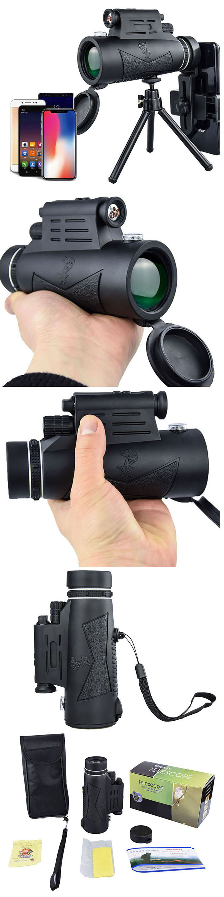 Deze HD-telescoop is klein, handig en eenvoudig te bedienen. Voor dit formaat is 12x onze meest aanbevolen vergroting om de stabiliteit van het beeld te garanderen. Het maakt gebruik van een grote objectieflens van 50 mm en het beeld is helder en helder. De telefoonhouder en het statief zijn optioneel - u kunt verbinding maken met de telefoon om 360°-video's te maken. Met LED-lichthulpverlichting kunt u 's nachts beter fotograferen. U kunt de uittredepupilafstand aanpassen door het oogmasker te draaien. Zelfs als u een bril draagt, kunt u een comfortabel gezichtsveld krijgen.