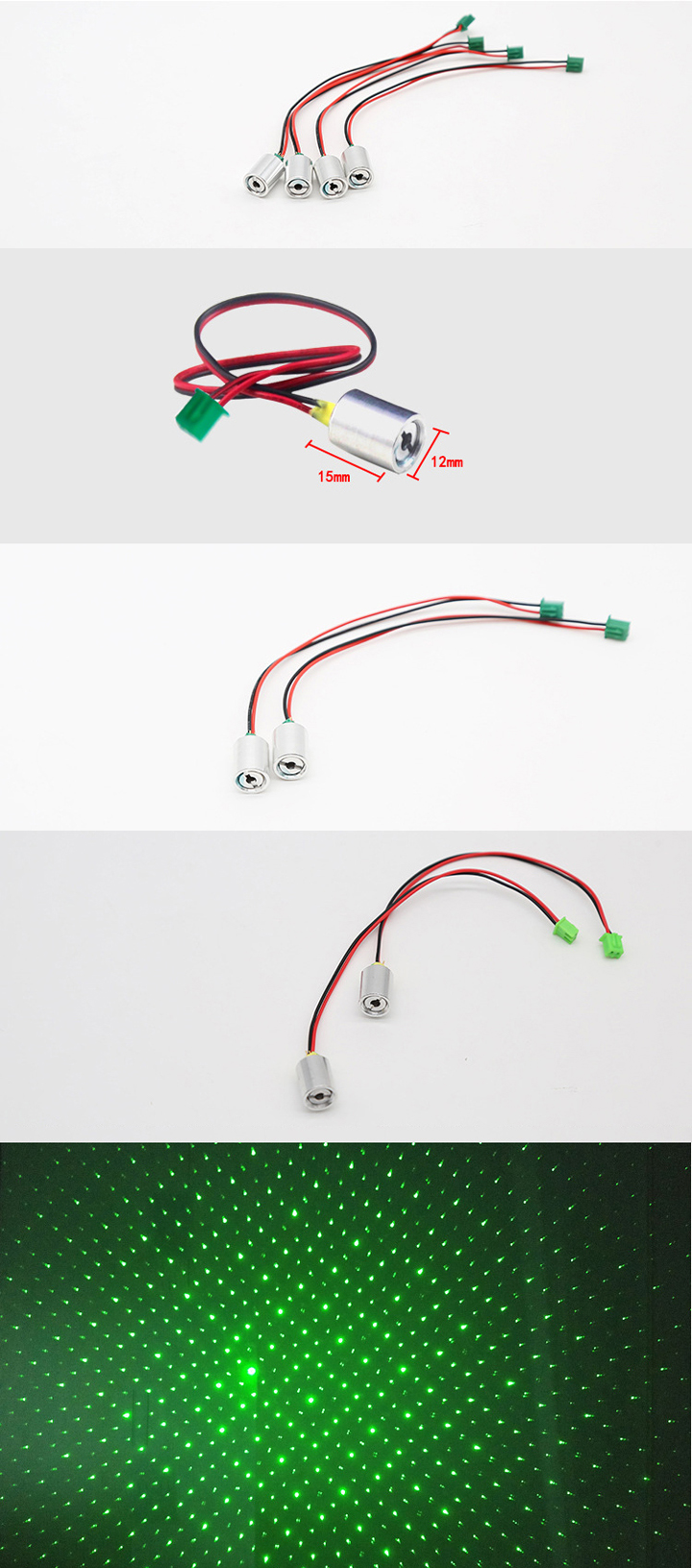Deze halfgeleiderlasermodule heeft kleine afmetingen, een golflengte van 515nm en een vermogen van 35mW. De opzetstukjes kunnen worden geïnstalleerd en verschillende patronen kunnen worden aangepast. Je kunt 's nachts heldere en mooie groene patronen zien. Het kan worden gebruikt voor gazonverlichting, kerstversieringen, podiumverlichting, enz.